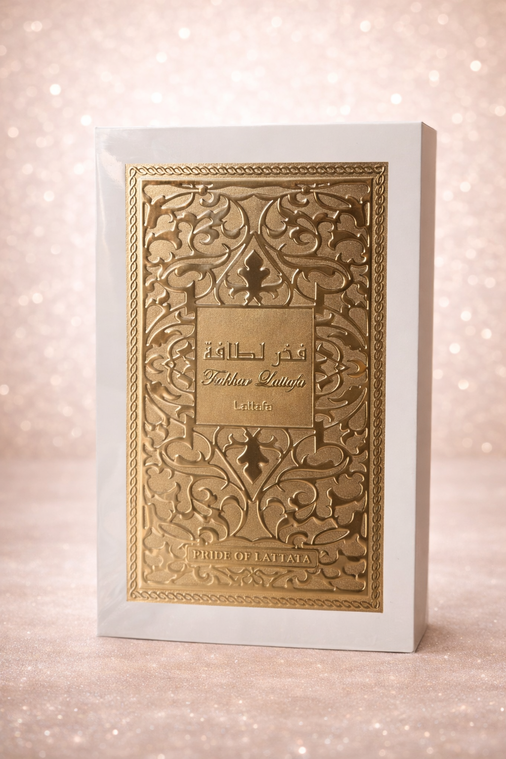 A embalagem apresenta design luxuoso e detalhado, com acabamento dourado e arabescos que refletem a tradição e a sofisticação da perfumaria árabe.